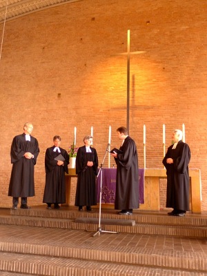 Dann kam das eigentliche Zeremoniell: Superintendet Krause wand sich mit einigen persönlichen Worten an beiden Pastoren. Anschließend entließ er sie feierlich aus dem Dienst in unserer Gemeinde und in unserem Kirchenkreis. Einige Konfirmanden rührten ihre Pastorin, die sie noch bis zur Konfirmation zu begleiten versprochen hat, mit Blumen und lieben Worten.