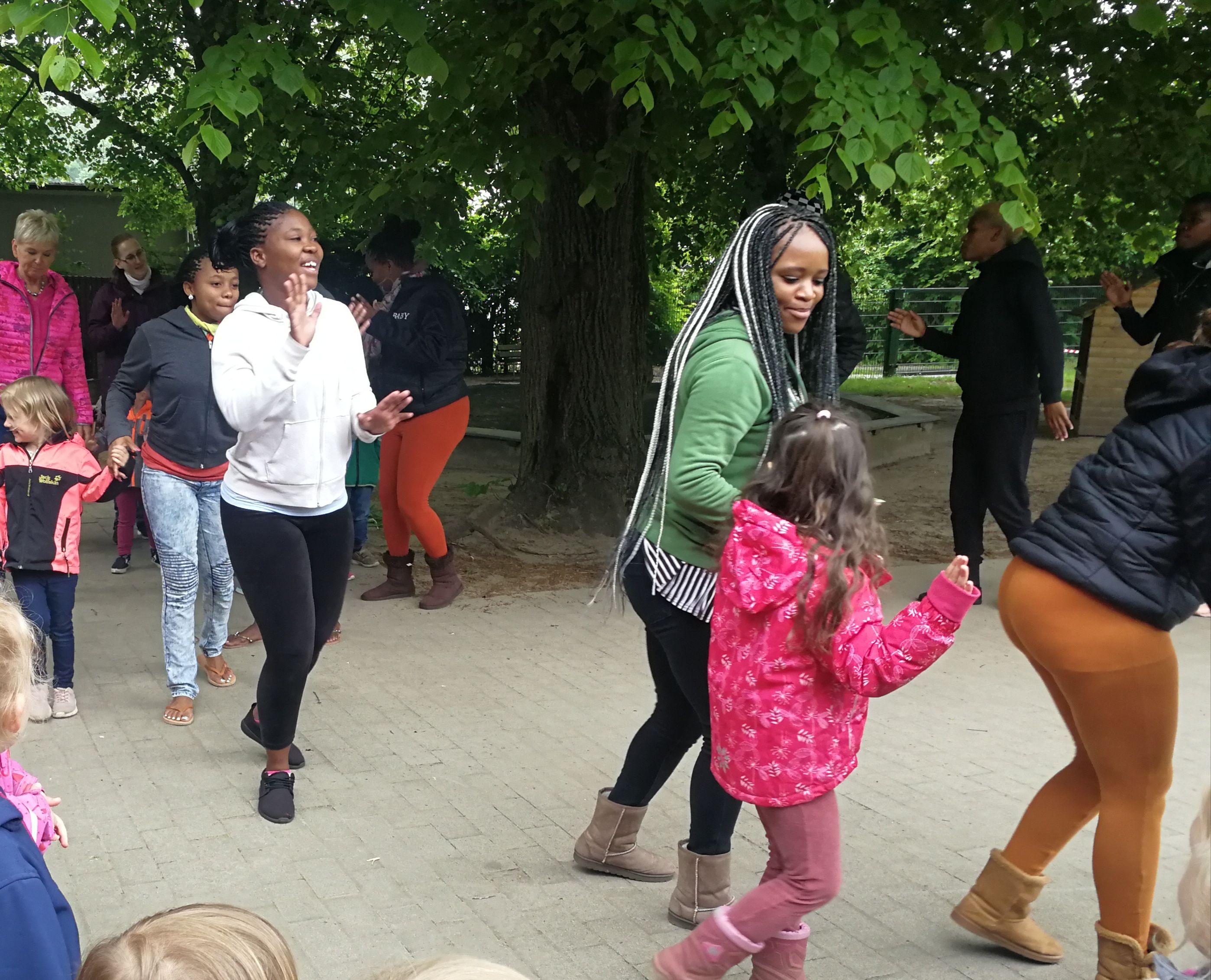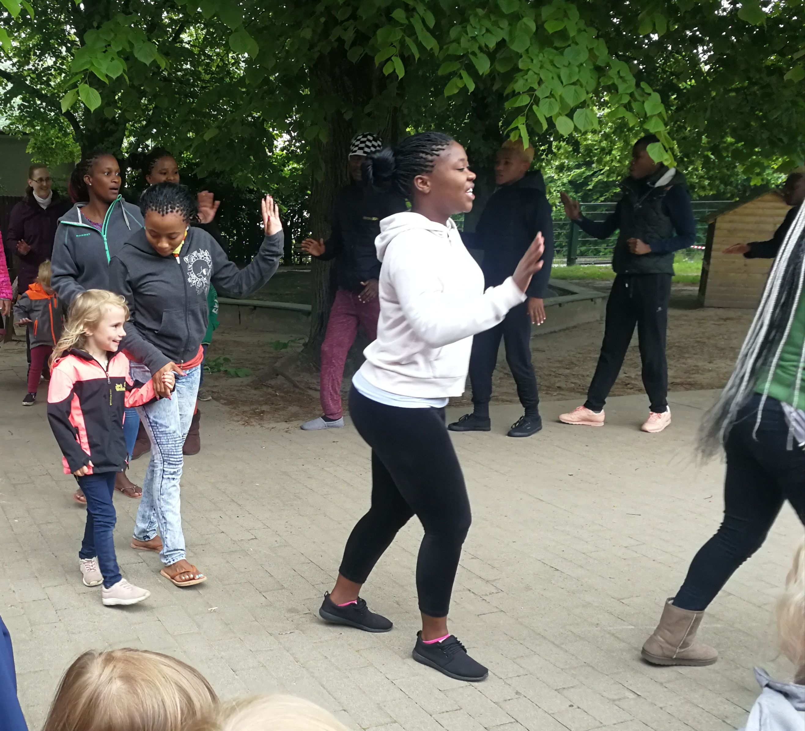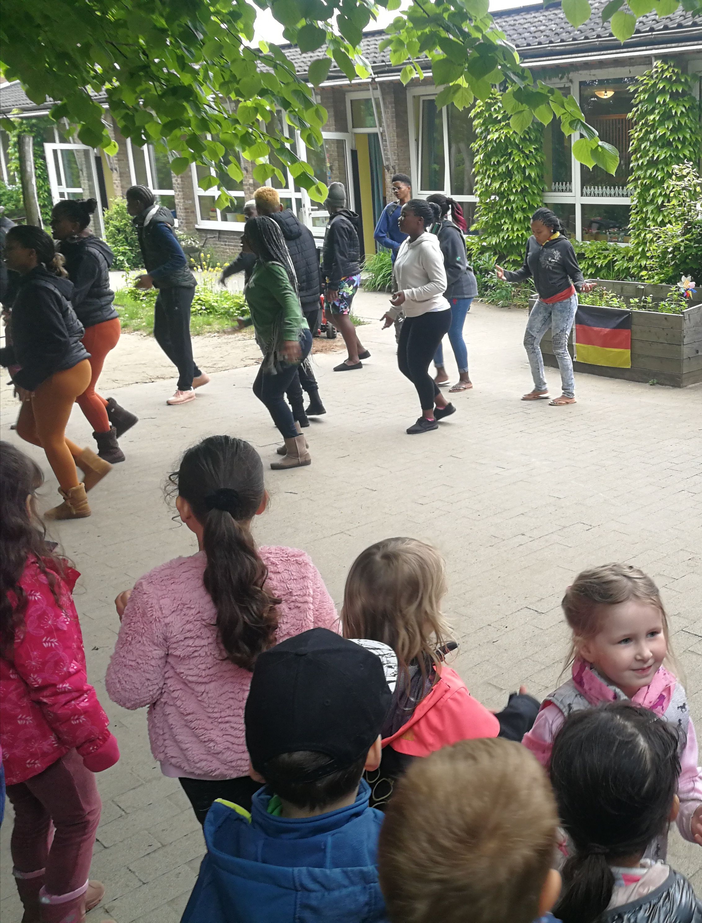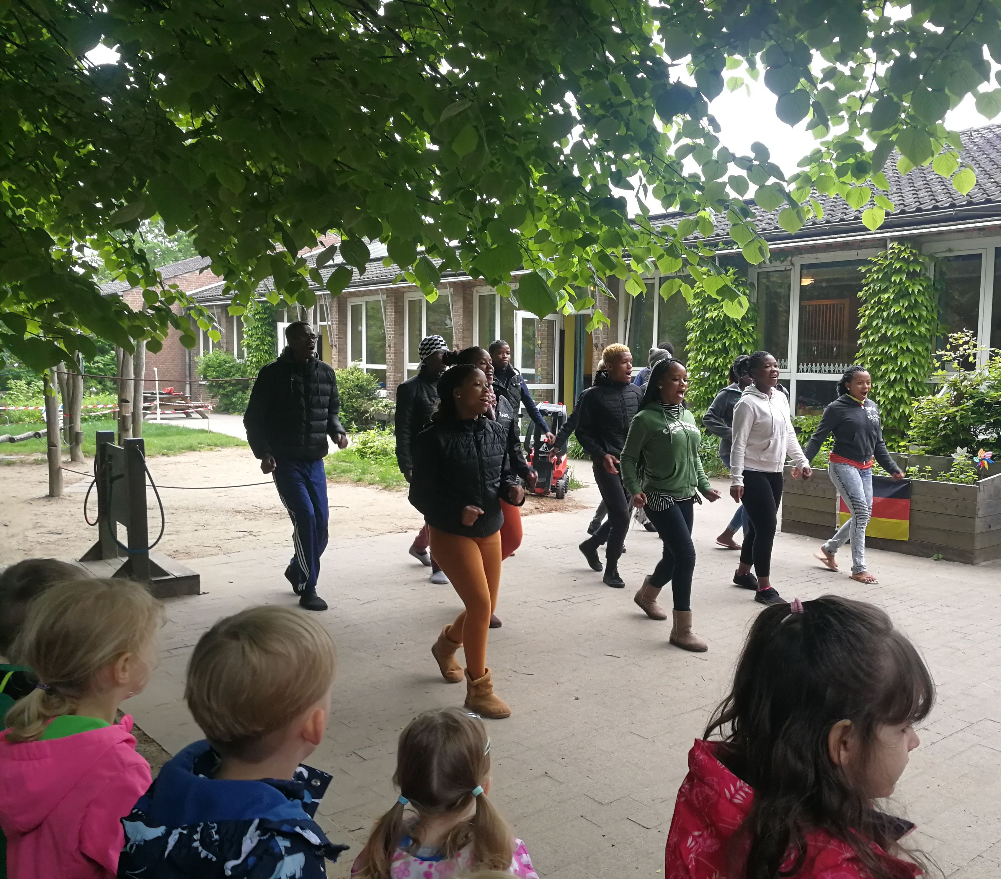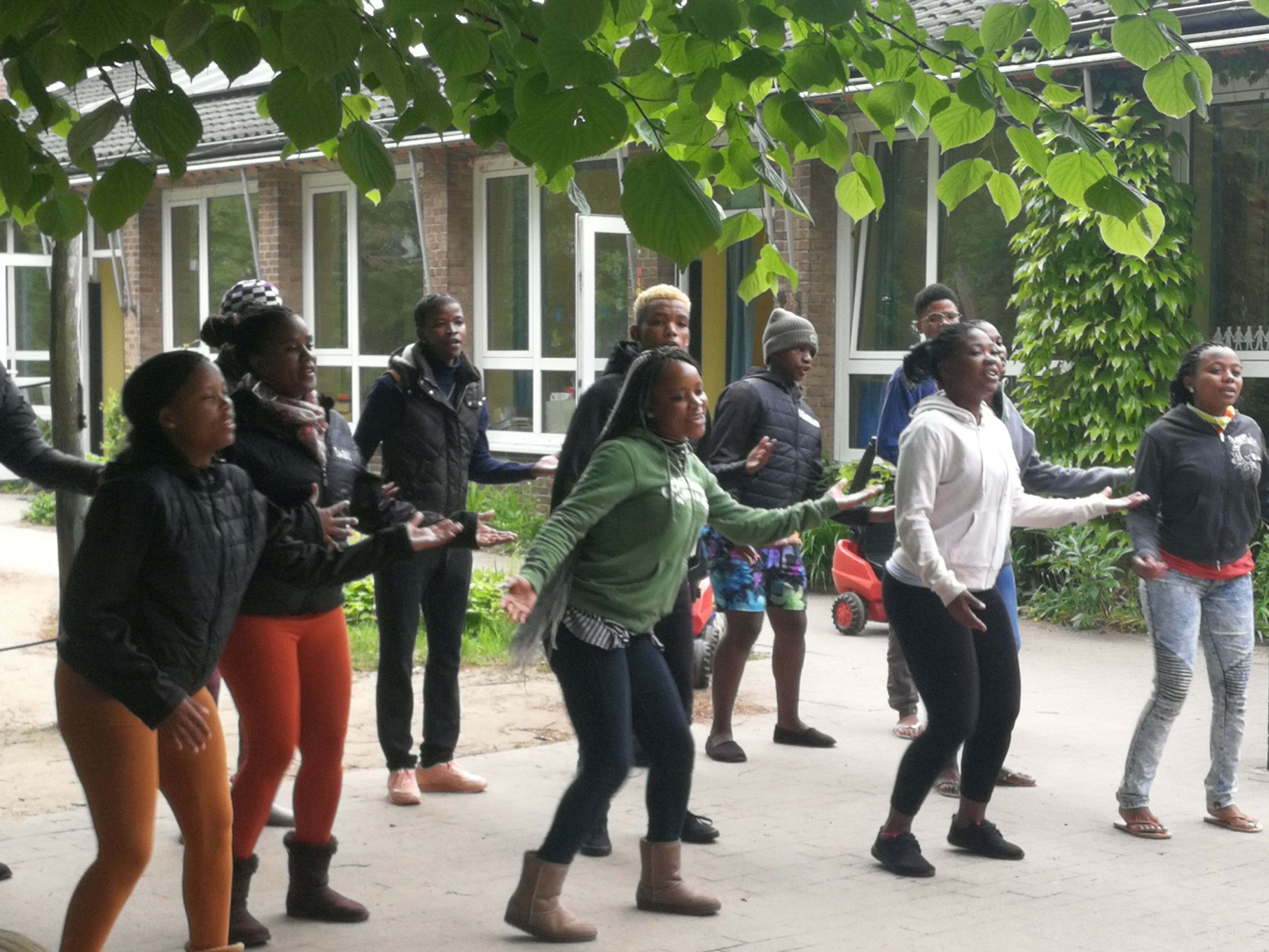 Afrikanische und deutsche Jugendliche sangen und tanzten – und animierten viele der vorbeieilenden Schüler*innen anderer Klassen zunächst neugierig stehen zu belieben und schließlich sogar einige sogar sich selbst im Rhythmus der Musik zu bewegen. Dabei wurden zwar auch kulturelle Unterschiede deutlich, denn manche Nationen sind der Bewegung stärker zugetan als scheinbar andere. Aber alle gemeinsam war die Freude am Miteinander ab zu spüren. „Ihr seid „Peacmaker“ – d.h. „Friedensstifter“ sagte darum zuletzt auch eine der Schülerinnen und richtete ihren Dank an den Chor.
