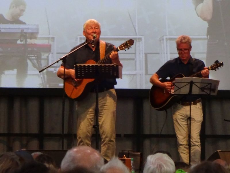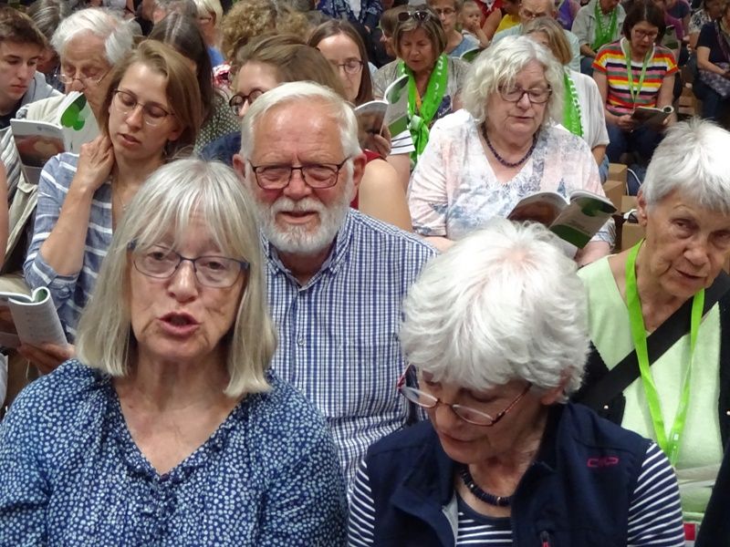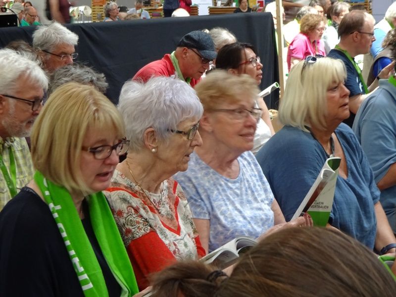 Fritz Baltruweit gelang es beim „Offenen Singen“ die Anwesenden mitzureißen. Viele suchten sich dann weitere Veranstaltungen auf dem Messegelände oder ließen sich beim „Markt der Möglichkeiten“ beeindrucken, wie viele Menschen bei „Kirche“ in vielen Bereichen aktiv und engagiert mitarbeiten und Ideen entwickeln und leben.