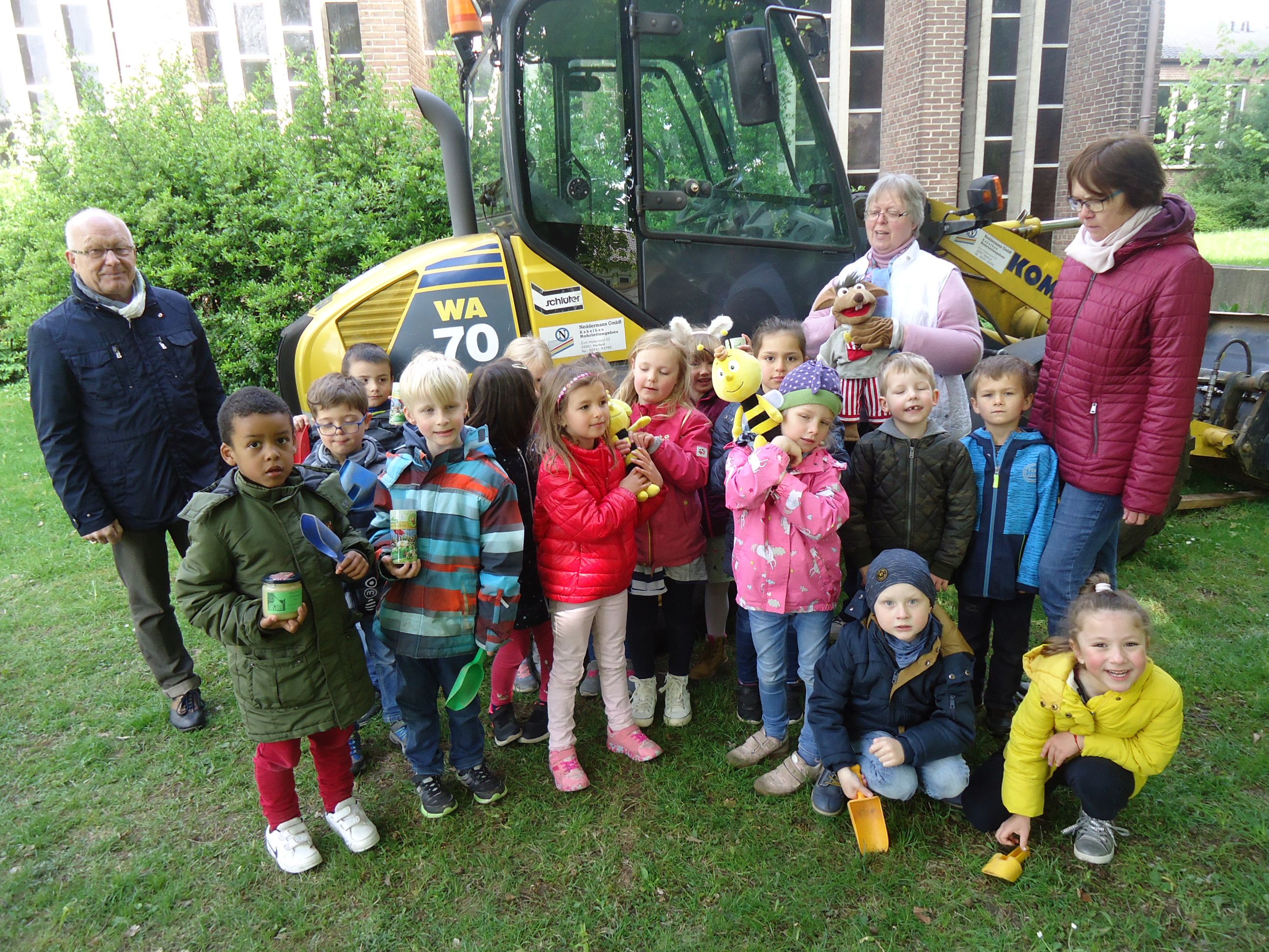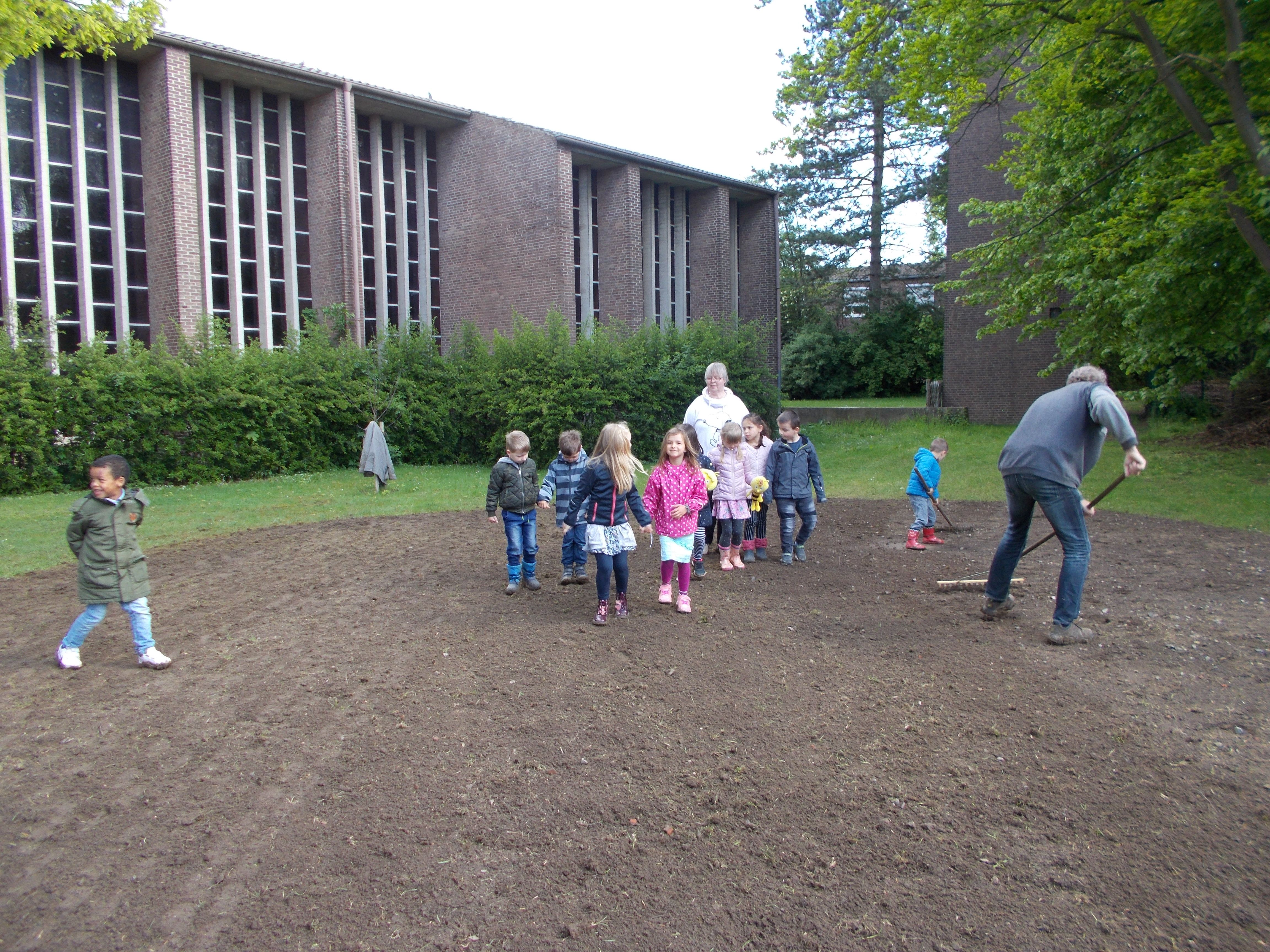 Zwar stellten die Kinder am ersten Tag fest, dass ihre kleinen Schaufeln, mit denen sie ausgezogen waren, die Fläche vor der Christuskirche vorzubereiten, nicht ausreichten, um die harte Erde aufzulockern. Aber schon drei Tage später konnte die dann vorbereitete Fläche eingesät werden.