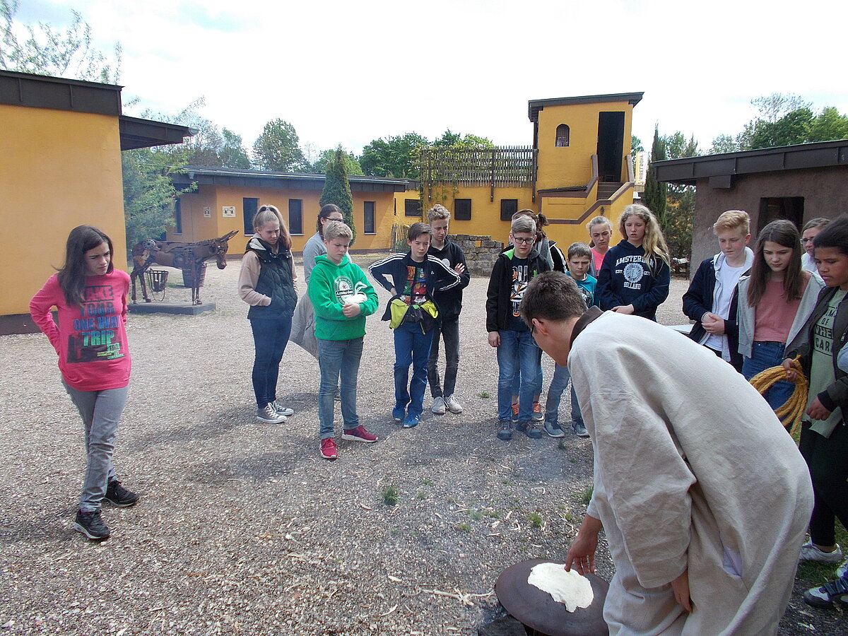 Und dann ging es genau dort hinein: in Leben zur Zeit Jesu. Alle lernten ein „Einraumhaus“ kennen, eine „Zollstation“, einen „Brunnen“ als zentralen und wertvollsten Ort im Dorfleben.. Danach wurden alle in Gruppen handwerklich gefordert. Manche waren in der Holzwerkstatt tätig und sägten, schnitzten und schufen einen Holzhammer. Andere fertigten in der „Seilerei“ ein kräftiges Tau (das später sicher noch beim „Tauziehen“ gute Dienste leisten wird) und wieder andere stellte aus vielen Kräutern, die in Mörsern fleißig zerkleinert werden mussten, ein sehr schmackhaftes Kräutersalz her.