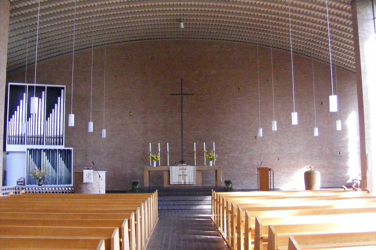 Der Kirchraum mit seinem leichten Tonnengewölbe ist geprägt von den hohen Ziegelwänden und sowie der hellen Fensterwand. Über dem Altar thront das ebenso schlichte wie markante Kreuz, das dem Innenraum der Kirche seine Besonderheit verleiht.